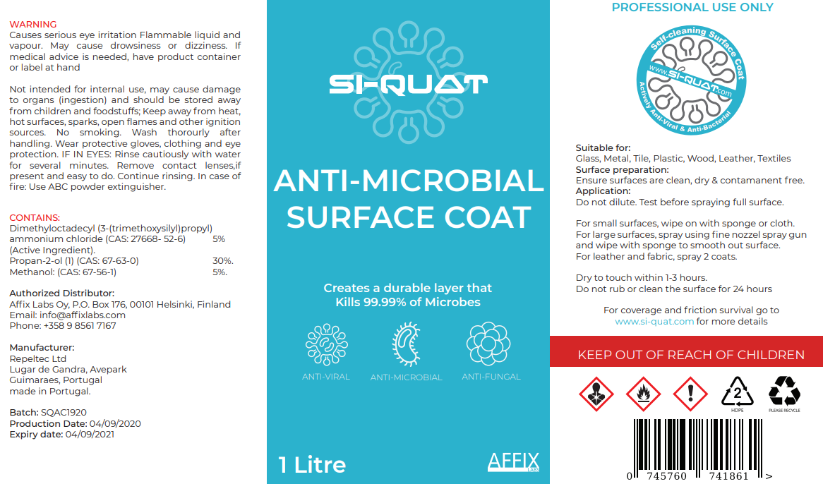 Si-Quat Affix Labs Si-Quat cas 27668-52-6, Active Ingredient: 3-(Trimethoxysilyl) propyldimethyloctadecyl ammonium chloride, casno:27668-52-6) helps to prevent cross contamination with a durable layer of polymerised active ingredient that binds to walls, handles, furniture and other key touch points, staying in place for up to 12 months and killing 99.9% of viruses and bacteria that come into contact with the treated surface. The coating has been tested and certified to be effective against bacteria, viruses and fungi, and has passed the rigorous EN45545-2 HL3 flammability norm for trains and REG118.3 for buses.